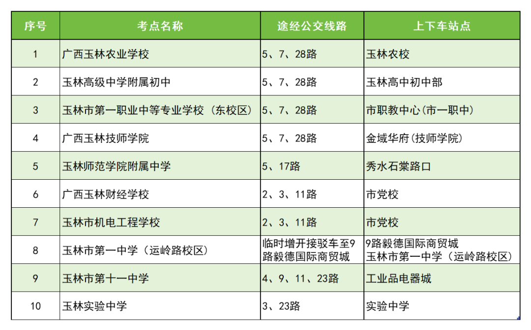 玉林市第一中學(xué)(運嶺路校區(qū))考點11:00-11:30,16:30-17:00 在考點安排公交車和值勤人員,負(fù)責(zé)將考生接送到9路毅德國際商貿(mào)城站點。