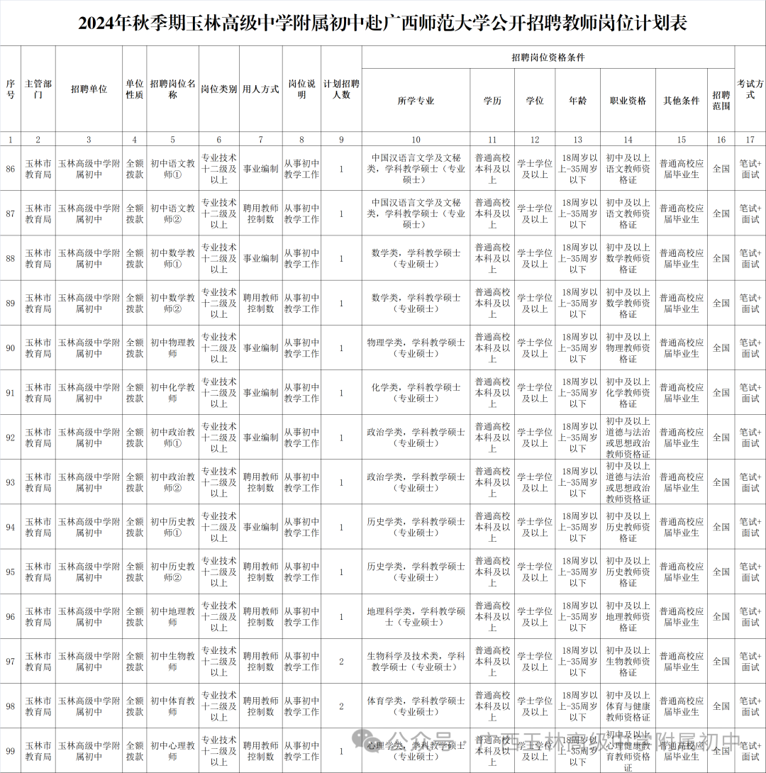 具體招聘信息請瀏覽玉林市人社局網(wǎng)站相關公告http://rsj.yulin.gov.cn/tszl/rsrc/sydwzk/t19343053.shtml,以《2024年秋季期玉林市教育局直屬學校赴廣西師范大學公開招聘教師公告》為準。