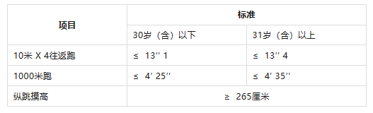 報(bào)考人員須參加全部三項(xiàng)體能測評。參加者凡有其中一項(xiàng)不達(dá)標(biāo)或放棄,視為體能測評不合格。體能測評合格,方可進(jìn)入下一環(huán)節(jié)。