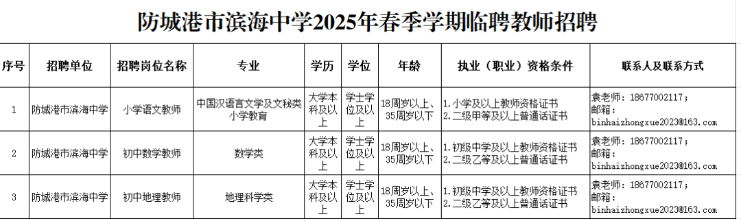 二、報(bào)名方式:1.將個人簡歷、學(xué)歷學(xué)位證書、教師資格證等發(fā)到郵箱:binhaizhongxue2023@163.com(郵件名稱備注:姓名+崗位+聯(lián)系方式)2.聯(lián)系電話:袁老師/18677002117