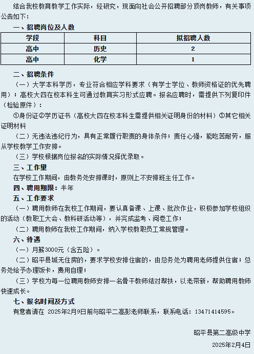 2025年昭平縣第二高級(jí)中學(xué)春季學(xué)期招聘頂崗教師公告