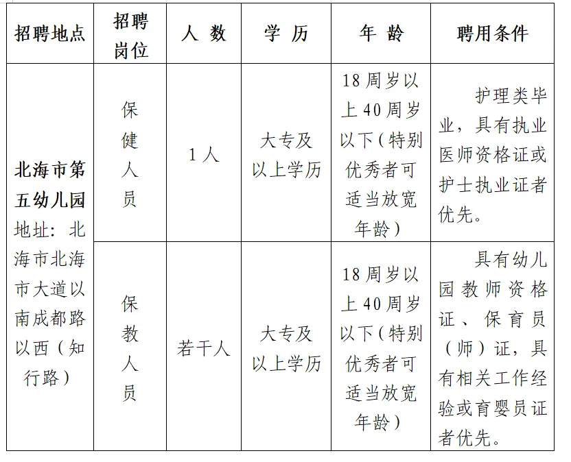 (二)報(bào)名方式:符合條件的報(bào)考人員請(qǐng)?jiān)趫?bào)名期間將報(bào)名表發(fā)至北海市第五幼兒園郵箱:bhswy@beihai.gov.cn,郵件主題為“報(bào)名應(yīng)聘崗位+姓名”。