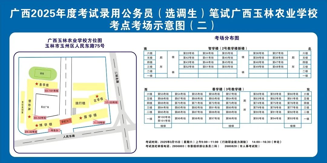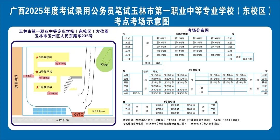 請?zhí)崆傲私獗救怂诳键c(diǎn)具體位置,熟悉考點(diǎn)周邊情況,特別是考點(diǎn)周邊的食宿、交通情況,合理做好食宿安排和出行計(jì)劃。需要特別注意的是:玉林市第一職業(yè)中等專業(yè)學(xué)校考點(diǎn)是設(shè)在該校的東校區(qū)(人民東路東235號);玉林市第一中學(xué)考點(diǎn)是設(shè)在該校的運(yùn)嶺路校區(qū)(二環(huán)北路1228號)!
