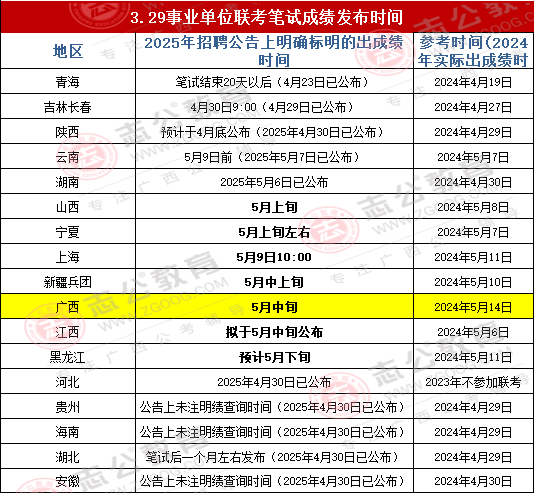 無論是青海還是貴州,或者是湖北,都是按照公告或去年出成績時間差不多的,那么2025年廣西事業(yè)單位筆試成績是否和2024年一樣為5月14日發(fā)布?