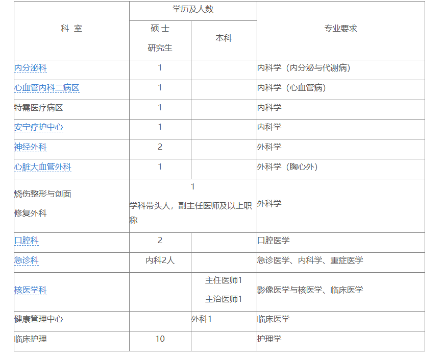 4.臨床醫(yī)師、醫(yī)技人員一般要求35周歲以下,特別優(yōu)秀者可酌情放寬條件;護理人員要求為應屆畢業(yè)生,30周歲以下,碩士研究生及以上學歷者可放寬年齡條件。