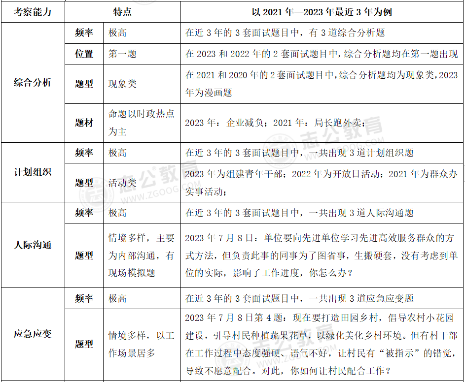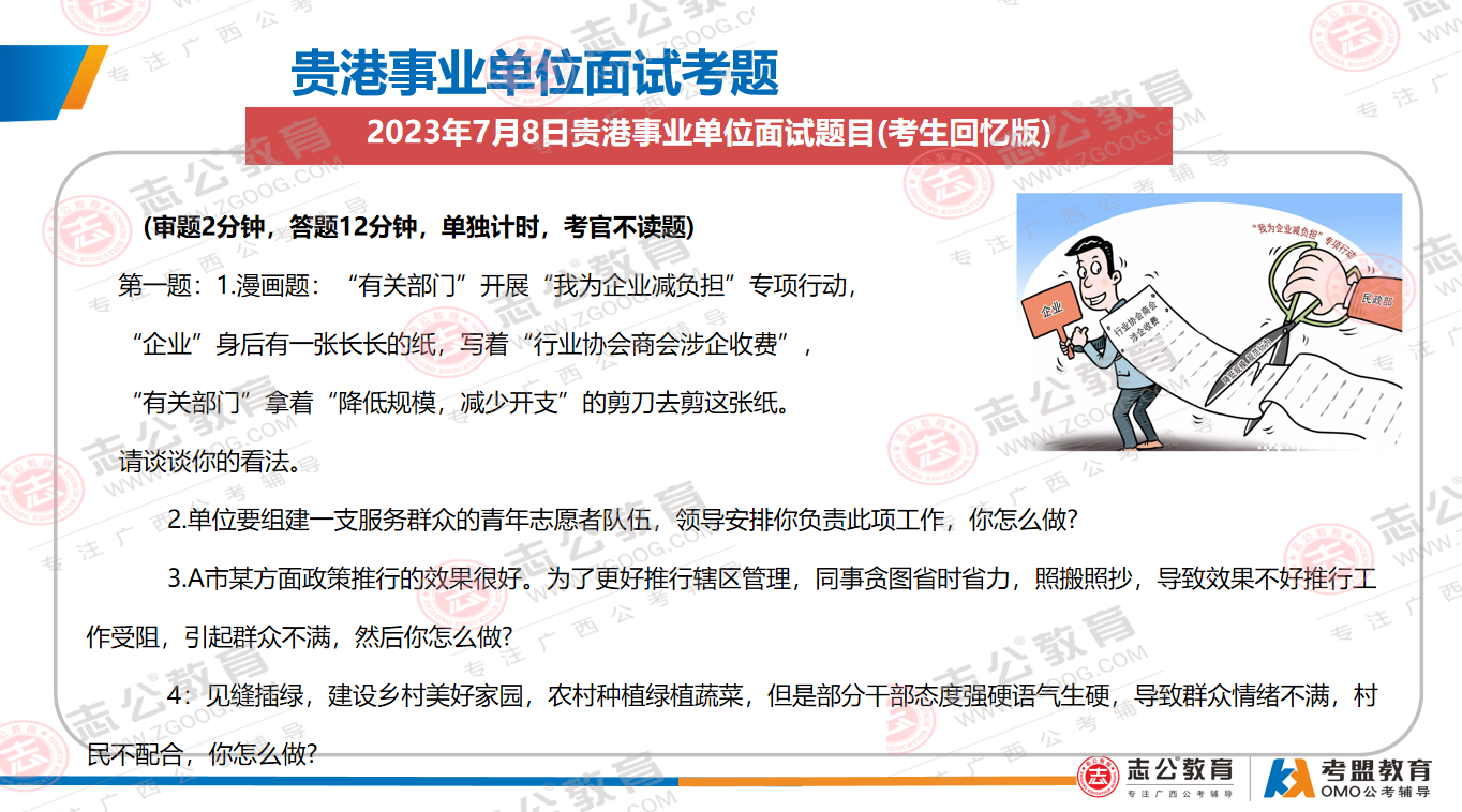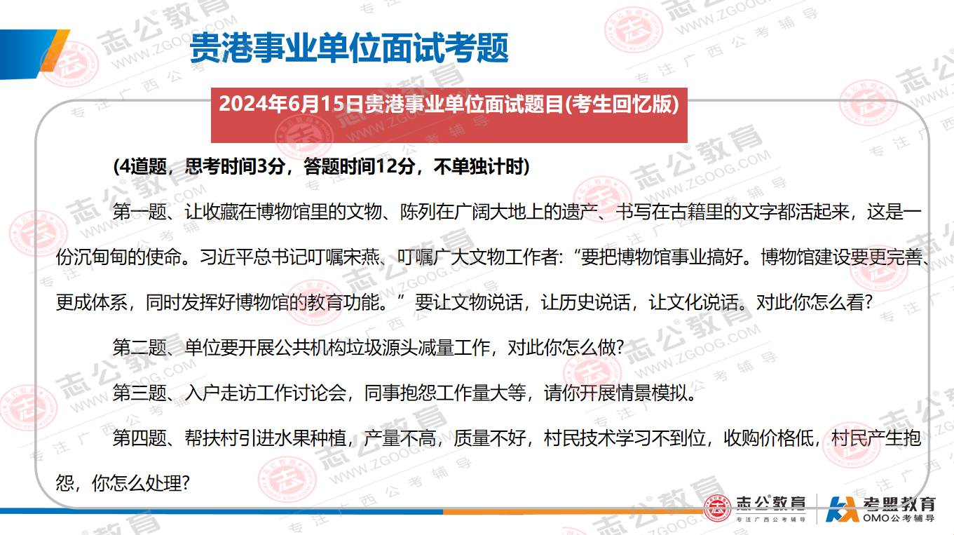 貴港事業(yè)單位面試主要采用結構化面試形式;審題時間:2分鐘;答題時間:12分鐘;考查題量:4題為主??紕涨闆r:考官不讀題、統(tǒng)一計時、超時會提醒。考查題型:綜合分析(極高)、計劃組織(極高)、人際溝通(極高)、應急應變(較高)、貫徹執(zhí)行(較高)、自我認知(一般)。