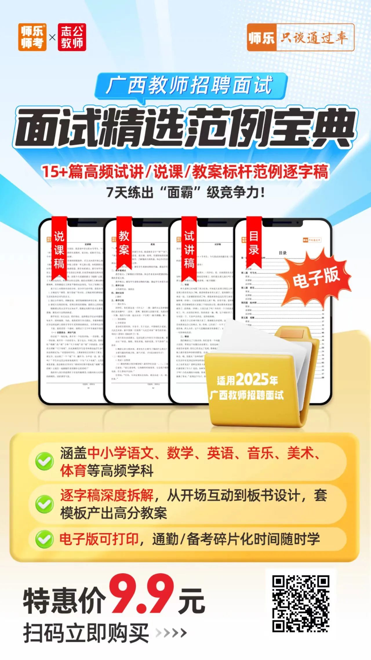 特惠價(jià):199元 ?結(jié)合歷年考情,分模塊系統(tǒng)梳理考試篇目 ?分篇目分步驟詳解教學(xué)設(shè)計(jì),提升備課速度 毫無(wú)思路怎么辦? 缺乏知識(shí)儲(chǔ)備怎么辦? 網(wǎng)課將精選核心課型 深入進(jìn)行教材梳理 網(wǎng)課內(nèi)容示例 ↓↓ 搶先體驗(yàn)價(jià):3.9元 ??語(yǔ)/數(shù)/英/幼/音/體/美/文綜/理綜 ??各學(xué)科高頻常考篇目 ??寫(xiě)作邏輯+面試導(dǎo)入金句點(diǎn)撥 ?含13+篇試講+說(shuō)課+結(jié)構(gòu)化 搶先體驗(yàn)價(jià):6.9元 ??14地市教招面試zhen題 了解試講/說(shuō)課/結(jié)構(gòu)化形式及內(nèi)容 面試禮儀課 ??面試禮儀干貨介紹 正反面案例直觀對(duì)比 ??著裝、問(wèn)候、儀態(tài)、言談禮儀等事項(xiàng)介紹 【師樂(lè)】廣西教招備考群 ??最新公告 備考資料 ??刷題打卡 考試交流