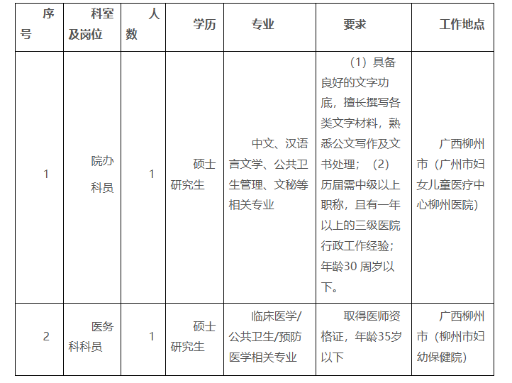 根據(jù)醫(yī)院發(fā)展需要,廣州市婦女兒童醫(yī)療中心柳州醫(yī)院、柳州市婦幼保健院現(xiàn)向社會招聘醫(yī)務(wù)科和院辦科員各一名,具體要求如下: