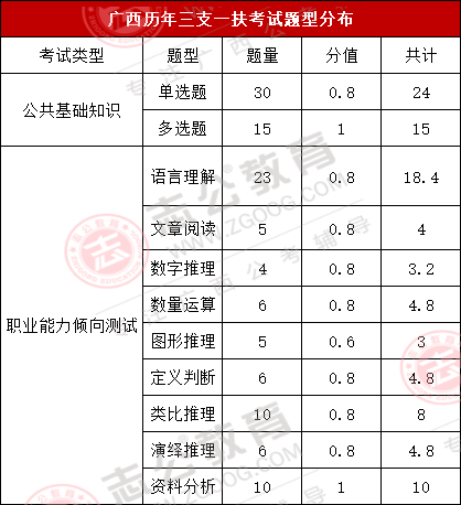 上篇我們寫(xiě)到,三支一扶的待遇,在廣西這個(gè)待遇還算不錯(cuò),政策上的支持也非常好,那么預(yù)計(jì)這個(gè)月月底出公告的三支一扶,啥時(shí)候筆試呢?2024年廣西三支一扶筆試時(shí)間是7月13日,其筆試科目為《綜合知識(shí)》一科,滿分100分?;谕昕忌幕貞洠C合知識(shí)內(nèi)容主要包括公共基礎(chǔ)知識(shí)和行測(cè)職業(yè)能力測(cè)試兩個(gè)科目,而各題型的題量及分值如下圖所示: