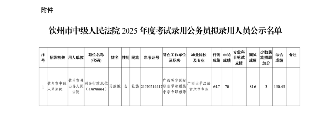 附件:欽州市中級(jí)人民法院2025年度考試錄用公務(wù)員擬錄用人員公示名單