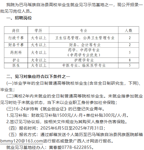 原文標(biāo)題:巴馬瑤族自治縣民族醫(yī)院2025年見習(xí)崗位招聘公告