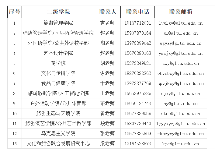 聯(lián)系地址:廣西桂林市雁山區(qū)良豐路26號桂林旅游學院人事處 郵 編:541006 聯(lián)系人:鄧老師