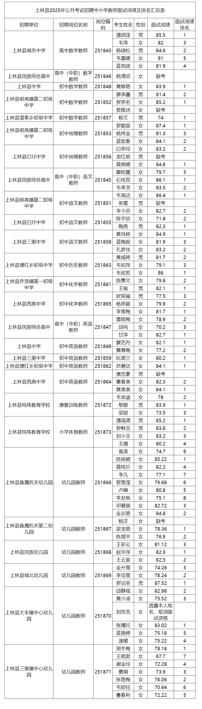 上林縣2025年公開考試招聘中小學(xué)教師面試成績及排名公告