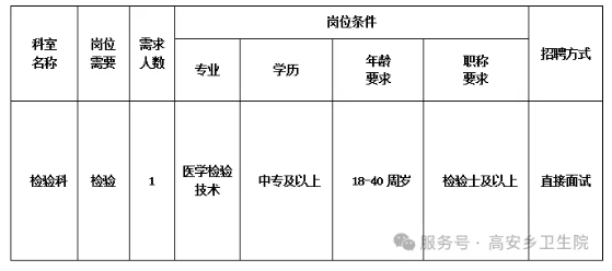 來賓市興賓區(qū)高安鄉(xiāng)衛(wèi)生院是一家集醫(yī)療、預(yù)防保健、康復(fù)醫(yī)療于一體的國(guó)家公立基層醫(yī)療機(jī)構(gòu),現(xiàn)有職工45人,服務(wù)人口約2萬人。因工作需要,我院擬向社會(huì)公開招聘編制限額外檢驗(yàn)科人員1名,現(xiàn)將有關(guān)招聘事項(xiàng)公告如下: