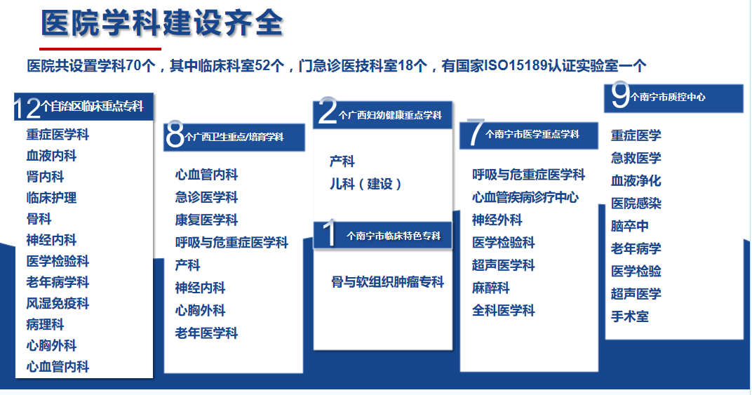 南寧市第一人民醫(yī)院(南寧市兒童先天性心血管疾病研究所、南寧市呼吸道疾病研究所、廣西醫(yī)科大學(xué)第五臨床醫(yī)學(xué)院、廣西醫(yī)科大學(xué)第五附屬醫(yī)院)始建于1914年,是一家擁有百年歷史的國(guó)家三級(jí)甲等綜合性醫(yī)院。醫(yī)院設(shè)有52個(gè)臨床病區(qū),18個(gè)門診醫(yī)技科室,總開放床位1912張(含分院)。醫(yī)院是國(guó)家高級(jí)認(rèn)知中心建設(shè)單位及國(guó)家神經(jīng)介入建設(shè)中心、國(guó)家ISO15189醫(yī)學(xué)檢驗(yàn)認(rèn)證機(jī)構(gòu),國(guó)家聯(lián)盟中心認(rèn)證的胸痛中心、卒中中心;擁有廣西臨床重點(diǎn)??疲ê嘤?2個(gè)、自治區(qū)醫(yī)療衛(wèi)生重點(diǎn)學(xué)科(含培育)8個(gè)、自治區(qū)婦幼健康服務(wù)重點(diǎn)學(xué)科(含建設(shè))2個(gè)、南寧市醫(yī)學(xué)重點(diǎn)學(xué)科7個(gè)、南寧市臨床特色優(yōu)勢(shì)???個(gè),南寧市質(zhì)控中心9個(gè)。醫(yī)院是國(guó)家衛(wèi)健委創(chuàng)面修復(fù)能力建設(shè)和繼續(xù)教育中心教學(xué)基地、國(guó)家級(jí)住院醫(yī)師規(guī)范化培訓(xùn)培訓(xùn)基地,廣西醫(yī)科大學(xué)碩士研究生培養(yǎng)基地,同時(shí)是暨南大學(xué)共建醫(yī)學(xué)教育基地、第十批廣西博士后創(chuàng)新實(shí)踐基地;醫(yī)院還具備國(guó)家藥物臨床試驗(yàn)機(jī)構(gòu)資質(zhì)(含I期研究室);醫(yī)院醫(yī)學(xué)實(shí)驗(yàn)中心獲批廣西科技廳重點(diǎn)實(shí)驗(yàn)室“廣西智慧精準(zhǔn)醫(yī)學(xué)實(shí)驗(yàn)室”,是南寧市衛(wèi)健系統(tǒng)唯一的省級(jí)重點(diǎn)建設(shè)實(shí)驗(yàn)室。2019年在市委市政府支持下,成立南寧市第一人民醫(yī)院醫(yī)療集團(tuán)?,F(xiàn)有27家成員單位,形成“1+4+22”(中心醫(yī)院+4家二級(jí)醫(yī)院+22家基層衛(wèi)生及養(yǎng)老機(jī)構(gòu))一體化格局,推行“三二一”運(yùn)營(yíng)管理模式,逐步構(gòu)建全生命周期健康管理鏈。