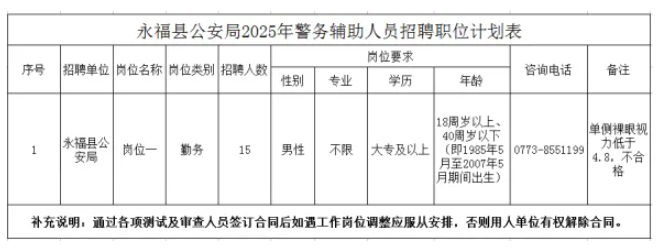 計劃招聘警務(wù)輔助人員15名。具體崗位、招聘人數(shù)、資格條件詳見《永??h公安局輔警招聘計劃表》。