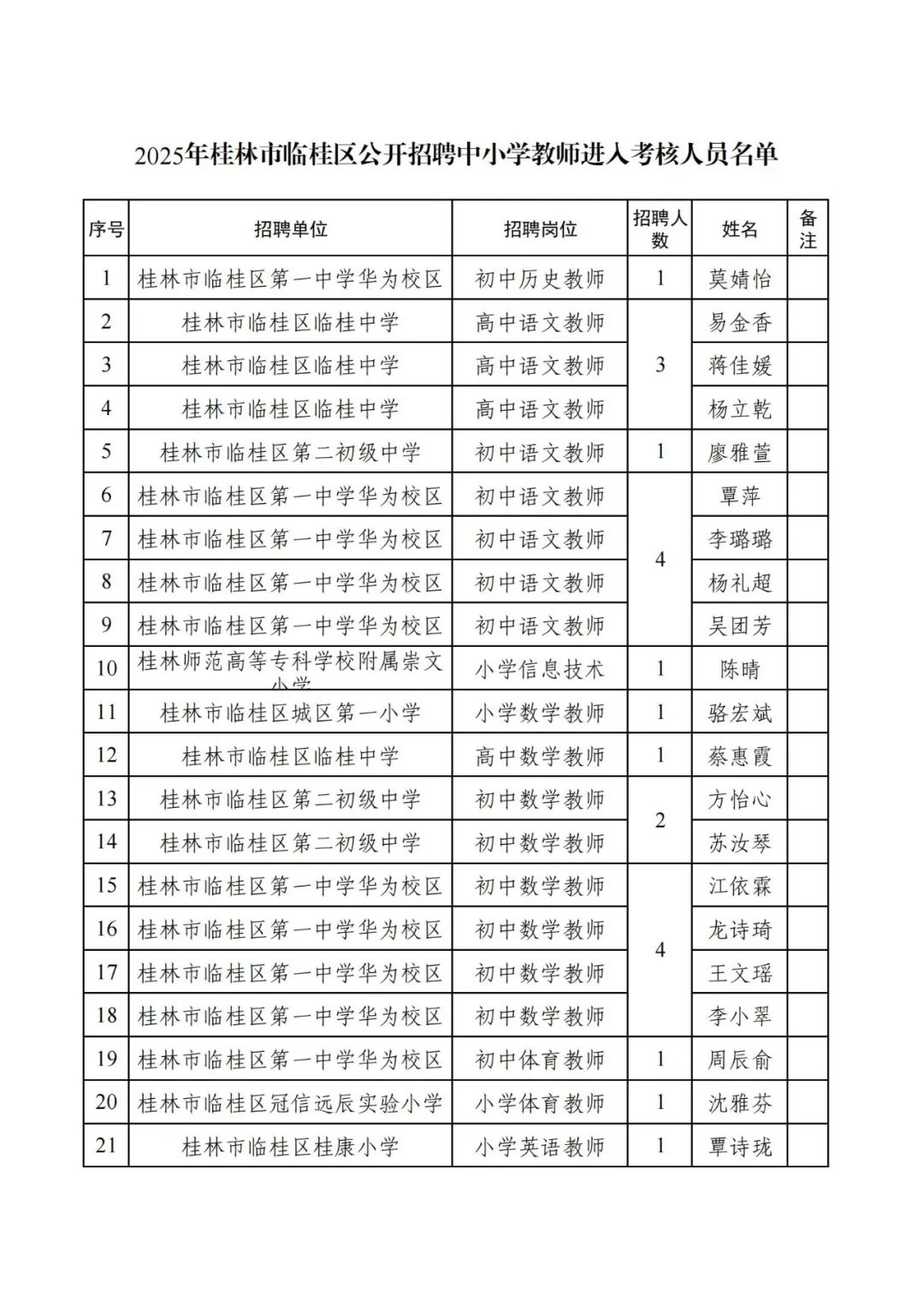 附件:2025年桂林市臨桂區(qū)公開招聘中小學教師進入考核人員名單