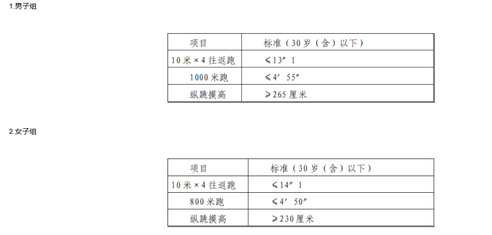 體能測評的標(biāo)準(zhǔn),參照《關(guān)于印發(fā)公安機(jī)關(guān)錄用人民警察體能測評項(xiàng)目和標(biāo)準(zhǔn)(暫行)的通知》(人社部發(fā)〔2011〕48號)的標(biāo)準(zhǔn),具體如下: