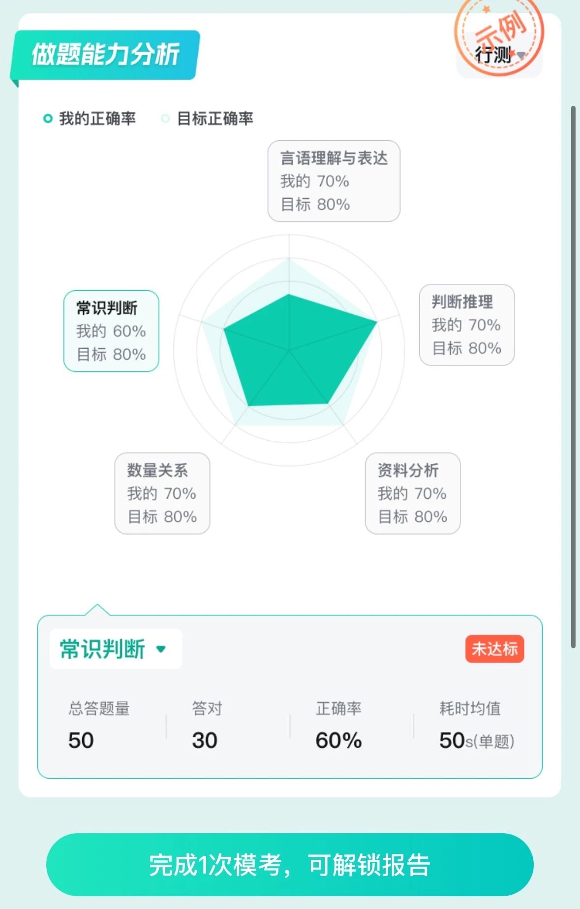 3??生成個(gè)人模考報(bào)告:考完就能查看??汲煽?jī)、排名及解析,生成的個(gè)人模考報(bào)告包含各模塊正確率分布、做題能力分析、筆試分?jǐn)?shù)yu測(cè)等內(nèi)容。