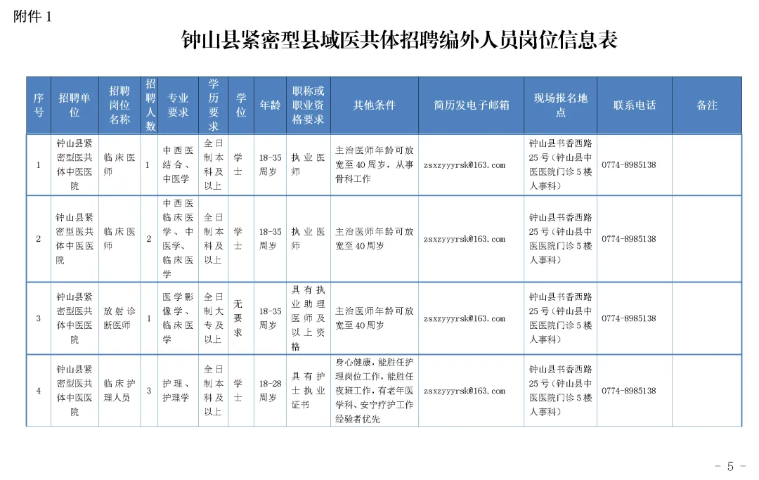 5.崗位具體信息及要求詳見(jiàn)附件1《鐘山縣緊密型縣域醫(yī)共體招聘編外人員崗位信息表》(如下圖)。