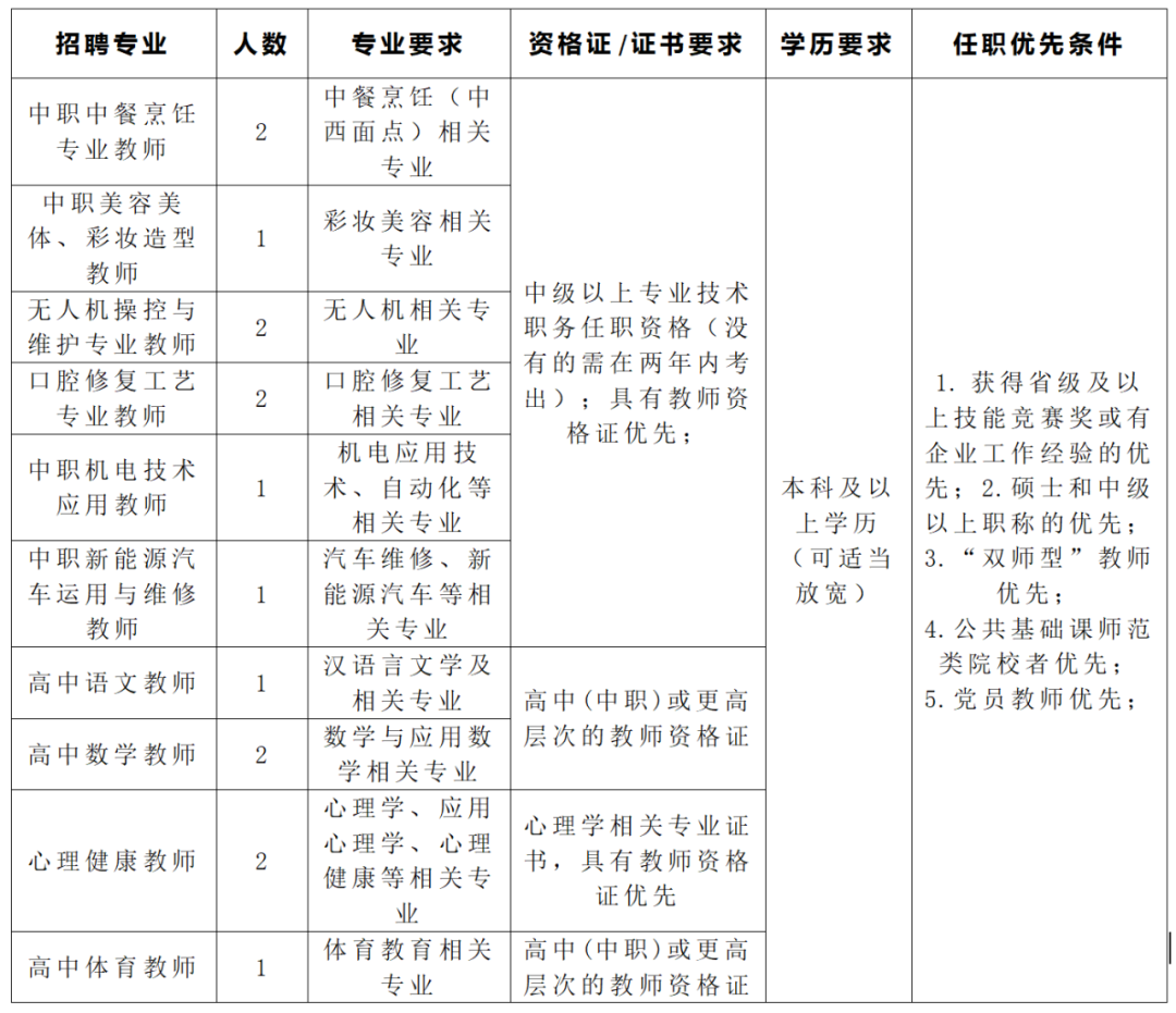 機(jī)電應(yīng)用技術(shù)、中餐烹飪、新能源汽車檢測與維修、平面設(shè)計(jì)、社會(huì)文化藝術(shù)、美發(fā)與形象設(shè)計(jì)專業(yè),各1人。